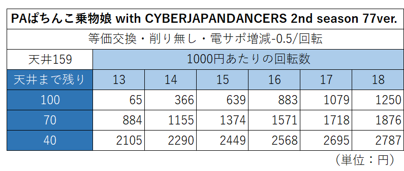 CYBERJAPANDANCERS 2nd season 77ver. | 1/77.1 | ST50 | 16.6 | 159 | 209 | 時短10000 | 0% | 回転数常時表示 |