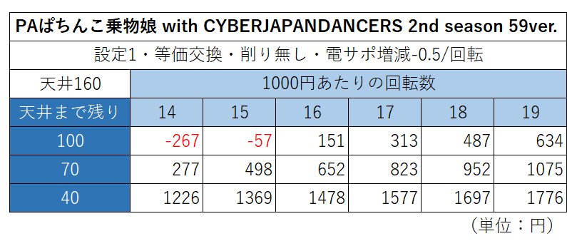 CYBERJAPANDANCERS 2nd season 59ver. | 1/99.9~99.1 | ST40 | 17.7 | 160 | 200 | 時短10000 | 0% | 回転数常時表示 |